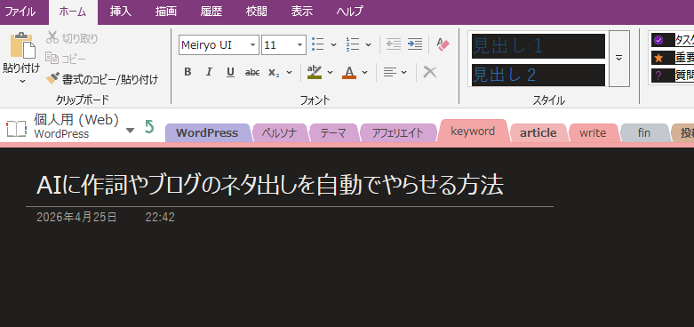 最初のステップは、信じられないくらいシンプルです。 通勤電車の中や、お風呂に入っているとき、ふと「あ、これブログに書けそうだな」と思いついたキーワードを、OneNoteの「keyword」タブに箇条書きで放り込むだけ。