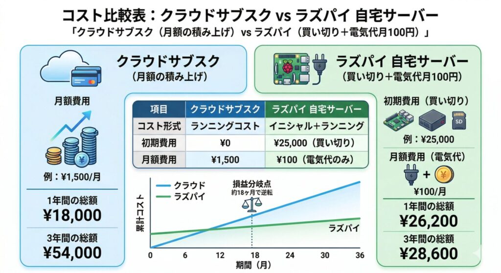 もし副業のサブスクツールを月1,500円契約していたとしたら、10ヶ月でラズパイの初期費用を回収できる計算です。それ以降は完全に「黒字の自動化基盤」として、何年でも働き続けてくれます。