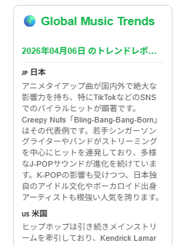週末のリラックスタイム用に組んだ仕組みです。毎週土曜、Geminiが日本・アメリカ・韓国・イギリス・ブラジルの最新音楽トレンドを調査し、その結果から自動でYouTube Musicのプレイリストを生成します。