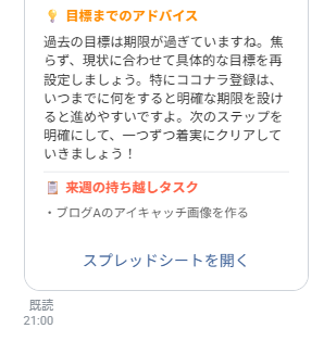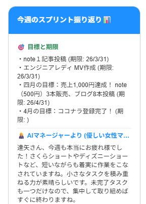 「先週は予定の70%を達成。Aプロジェクトの遅れが目立つので、今週は前倒しで着手することを推奨します」といった具合に、AIがマネージャー役として自分自身にフィードバックしてくれます。1人で副業をやっていると陥りがちな「振り返りが甘くなる」問題を、機械的に解決できる仕組みです。