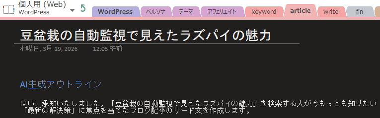 毎日コツコツと貯まっていくテーマ案の中から、ピンと来たものを選んで執筆するだけ。「ネタを考える時間」というクリエイティブのボトルネックそのものを自動化できます。